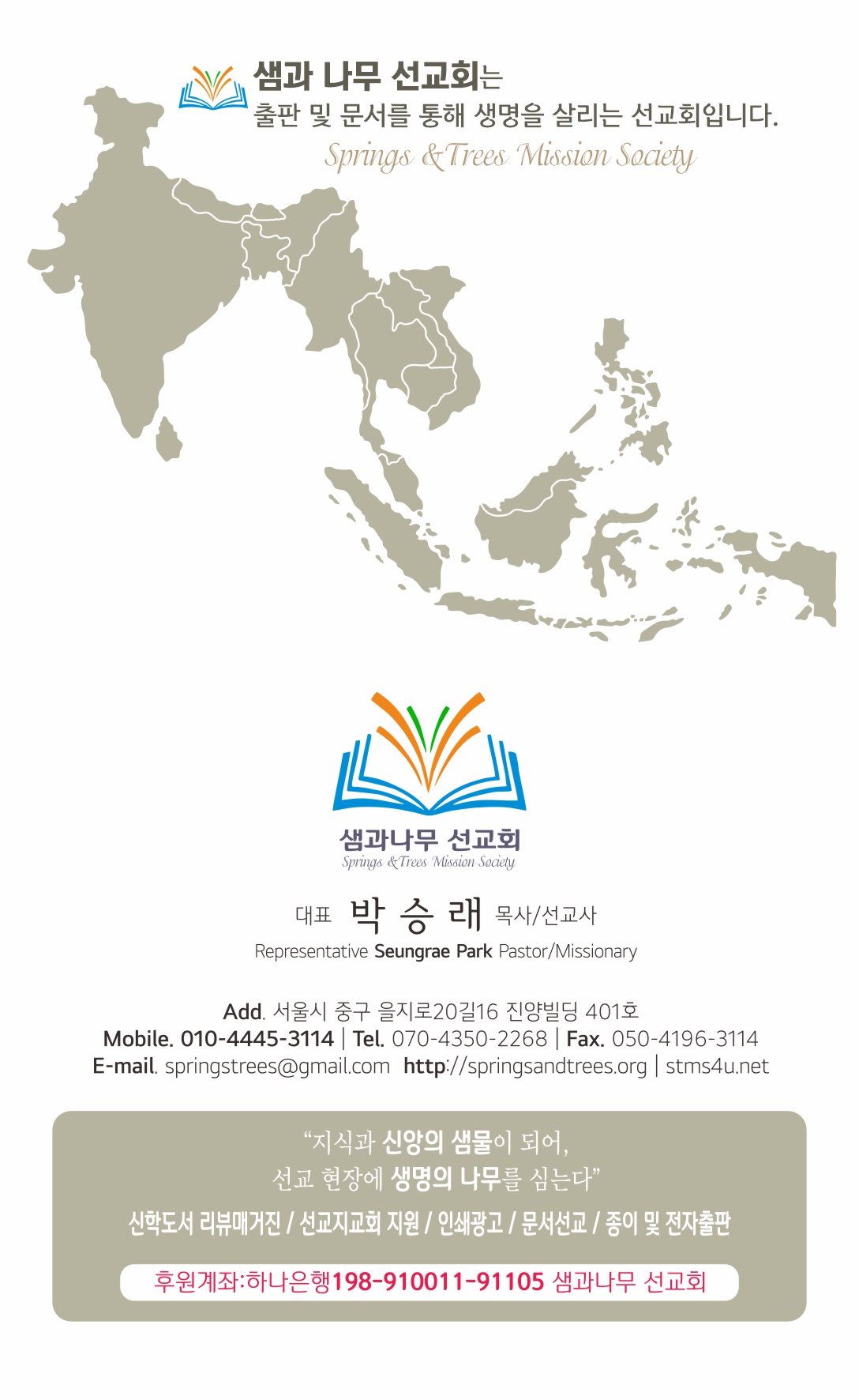 샘과나무 선교회는 어려움을 돕고자 세워진 출판 전문 선교회입니다. 이 사역이 우리의 전문 사역입니다. 주저하시지 마시고 언제든지 연락주시면 저의 능력 범위내에서 도움을 드리겠습니다.